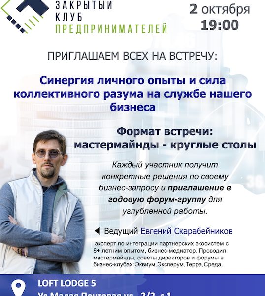 2 октября мы собираем сильных предпринимателей клуба на новый формат — стратегическую бизнес-сессию ««Синергия личного опыта и сила коллективного разума на службе нашего бизнеса» с Евгением Скарабейниковым
